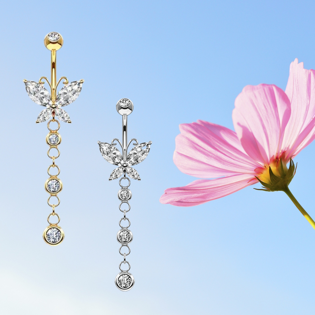 - This is a butterfly belly ring with a diamond dangle. Our gold option is 14 karat gold and our silver option is 14 karat white gold. These rings will not tarnish and can last you a lifetime.
