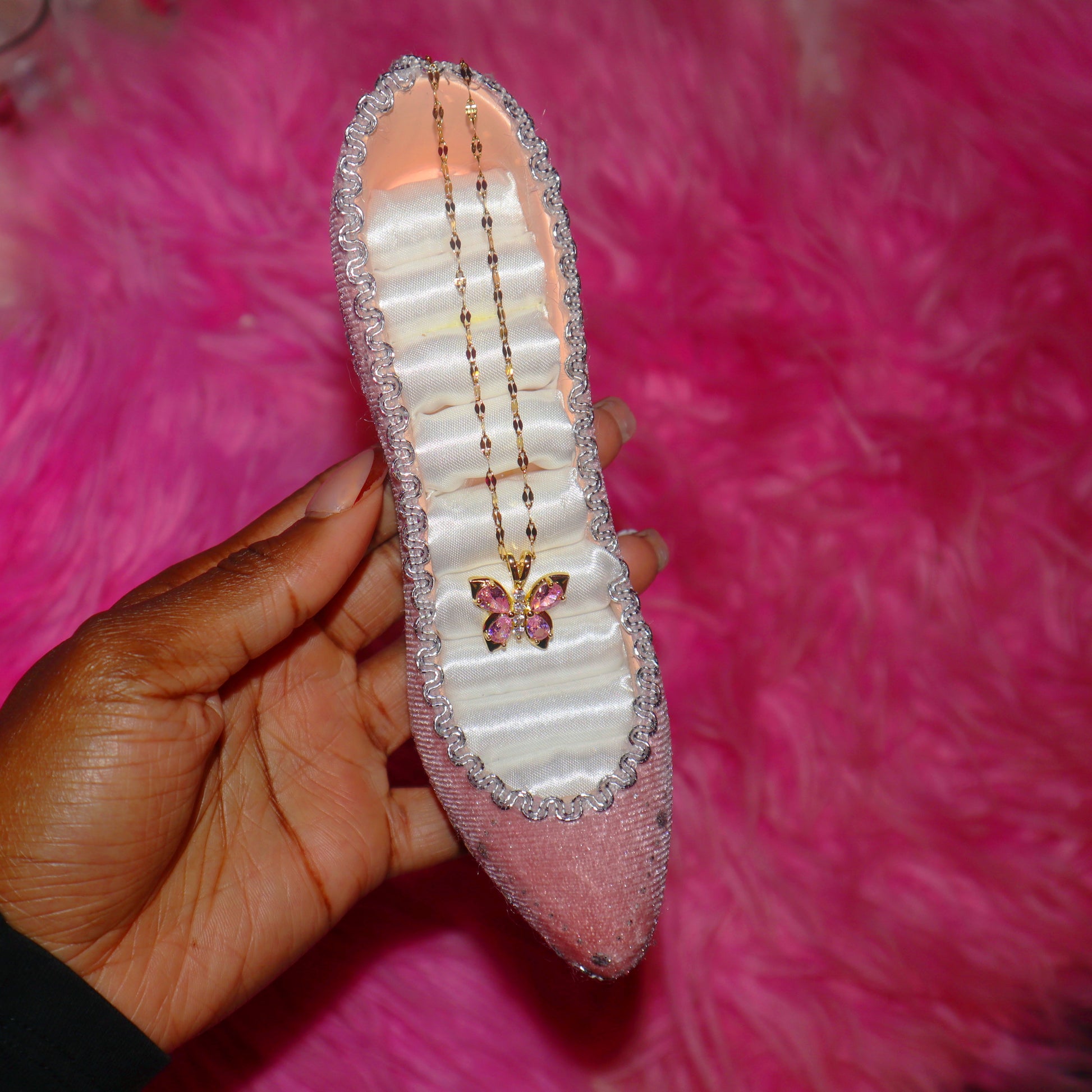 Elevate your jewelry collection with this stunning butterfly pendant necklace. Featuring a delicate gold-tone chain and a beautifully crafted butterfly charm adorned with sparkling pink stones, this piece adds the perfect touch of elegance and femininity. Whether you're dressing up for a special occasion or adding a subtle shimmer to your everyday look, this necklace is a must-have. Lightweight, stylish, and timeless—it's the perfect gift for yourself or a loved one!